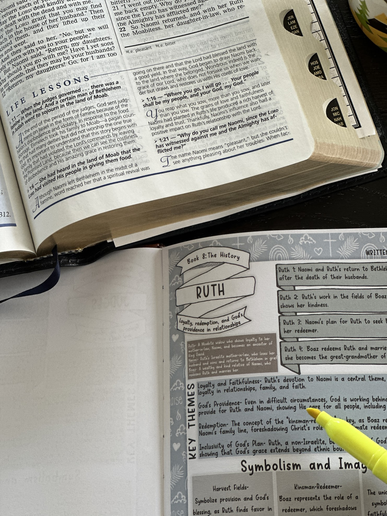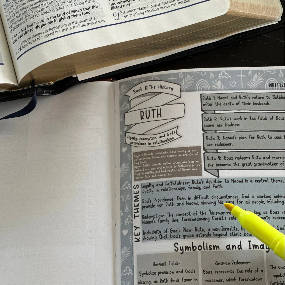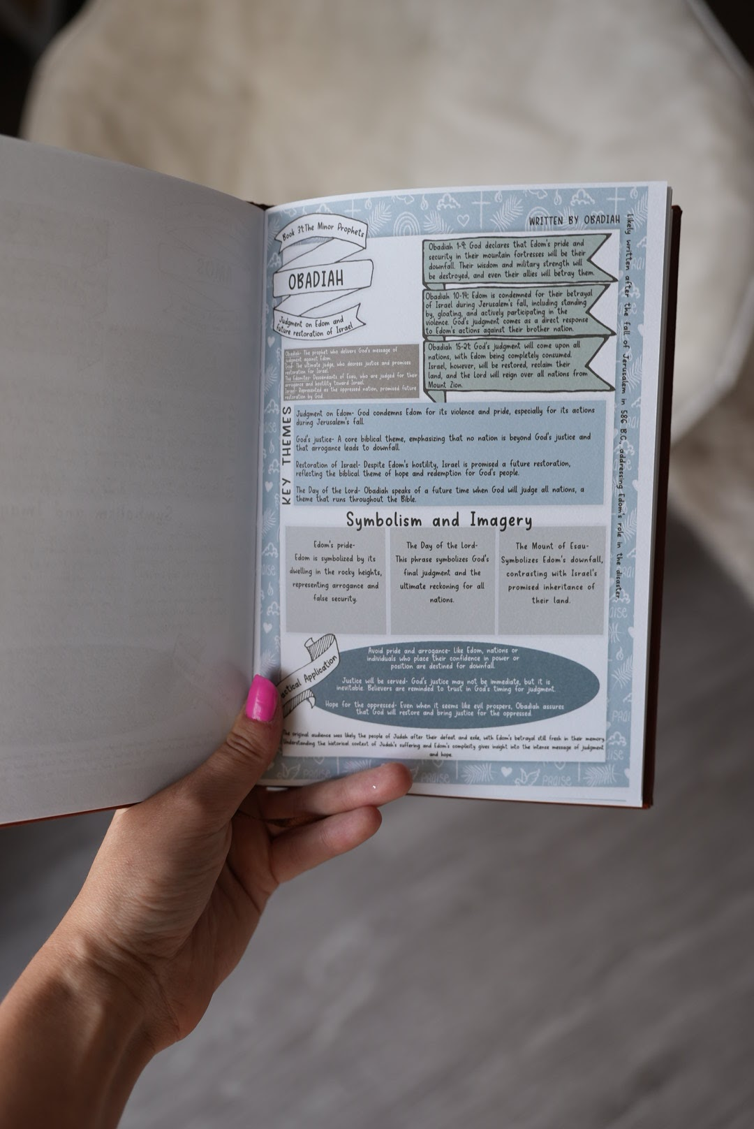 The entire Bible — all 66 books — is covered in 66 pages. Each page is dedicated to a single book. Before you open that book of the Bible to read it, you read that page first. It gives you the background you need so that when you sit down with Scripture, you are not starting from scratch. You know who wrote it, when, why, and what was happening in the world at the time. That context changes everything about what you are about to read.